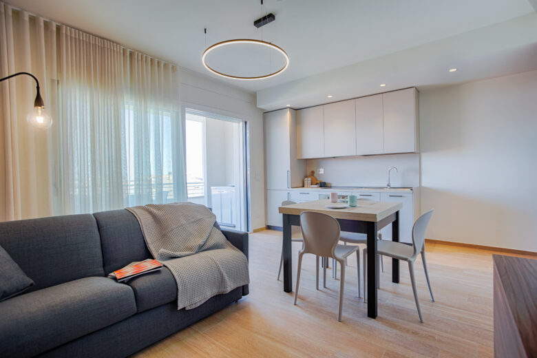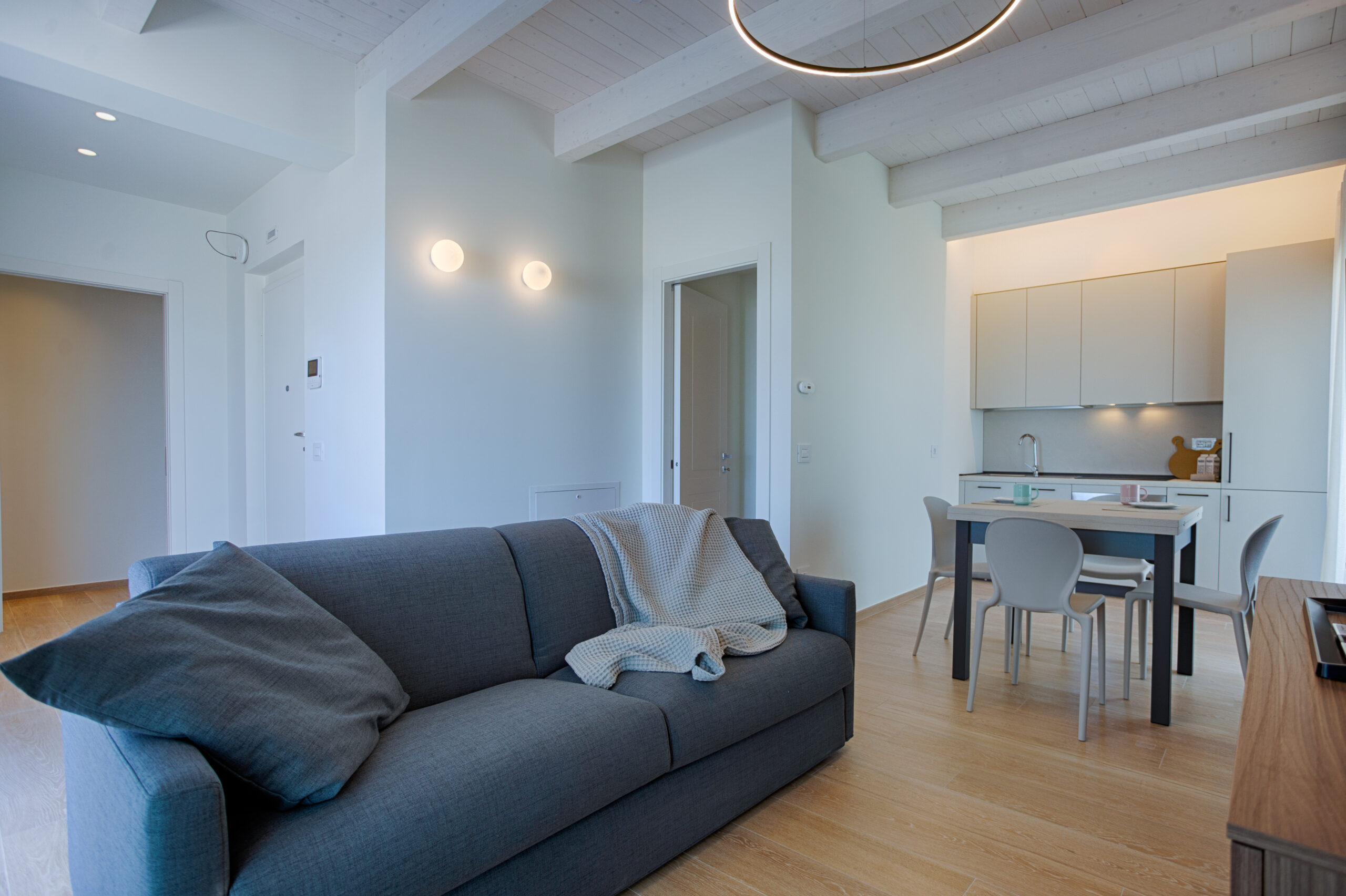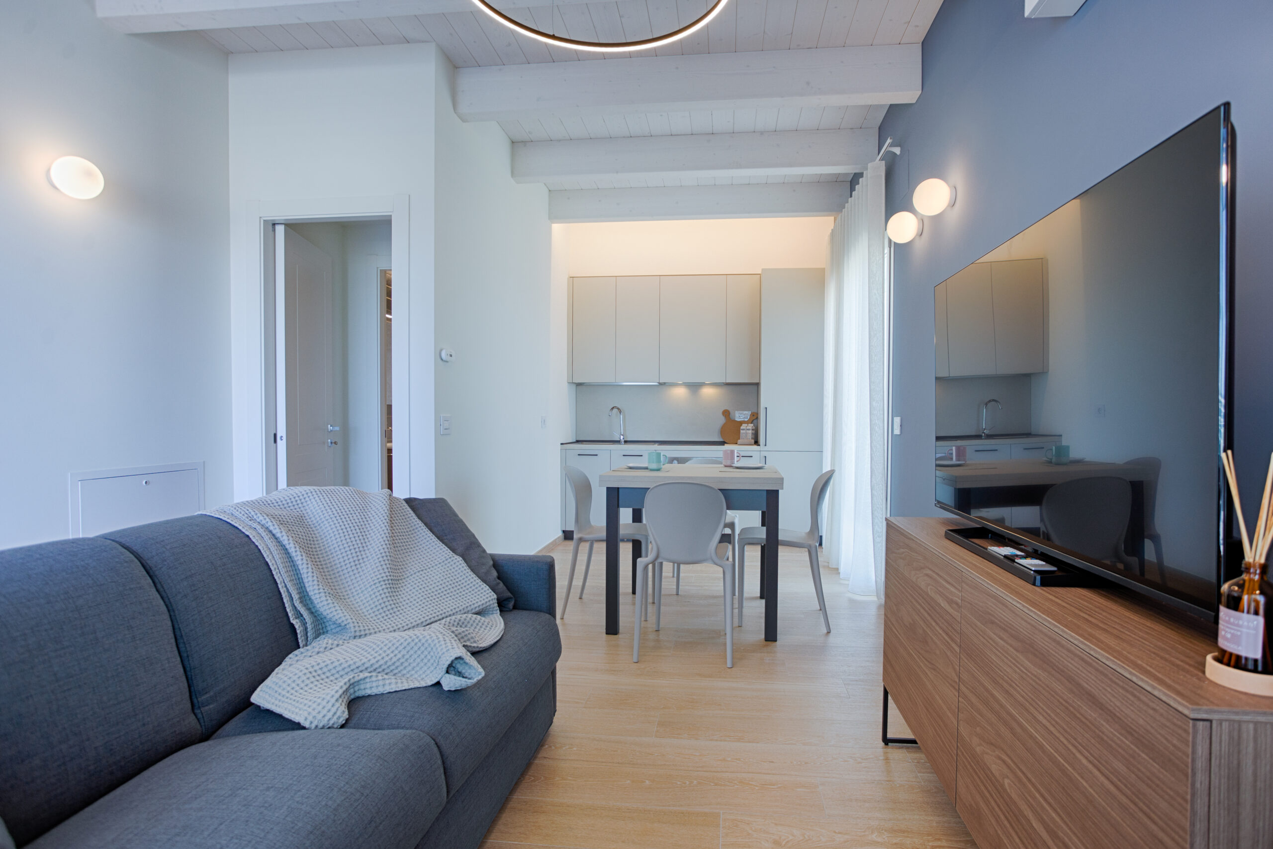 L’ingresso vi accoglie in un luminoso e spazioso soggiorno, arredato con un elegante divano letto matrimoniale estraibile, ideale per ospitare eventuali ospiti aggiuntivi o per un momento di relax dopo una giornata trascorsa esplorando la città. Qui troverete anche un moderno angolo cottura completamente attrezzato, dotato di tutto il necessario per preparare i vostri pasti preferiti con facilità.